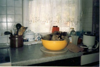 Dieses "ETWAS" kommt im Tierheim auf mich zu. Es ist ein Persermädchen, ca. 8-9 Monate alt - schildpatt. Die gelbe Farbe hat nur noch für einen kleinen Klecks auf der Nase und an der Pfote gereicht. Der Rest ist dunkel gesprenkelt. Am liebsten würde ich sie gleich mitnehmen. Aber da ist ja noch der Durchfall. Man vertröstet mich noch ein paar Tage. Leichtverdauliches Futter habe ich schon besorgt, denn es soll ihr so schnell als möglich gut bei uns gehen.