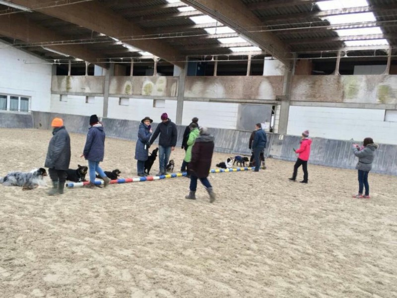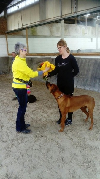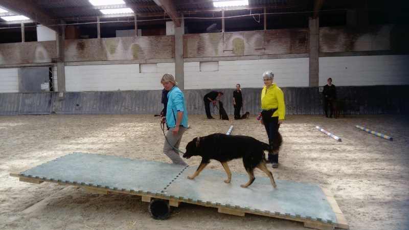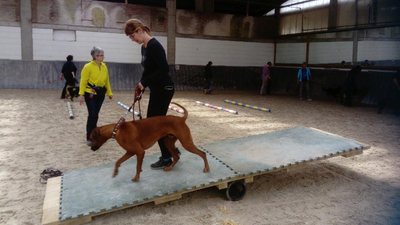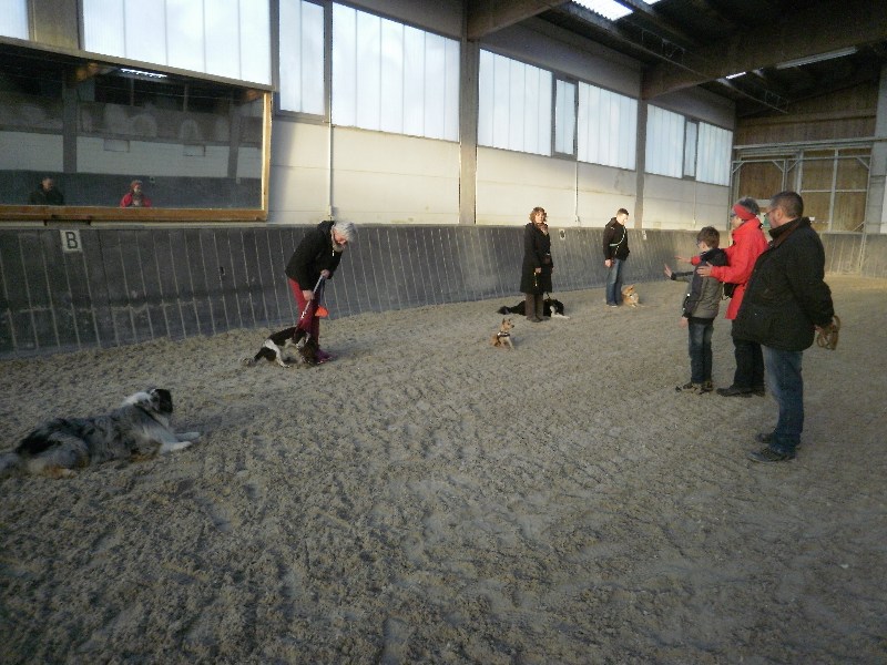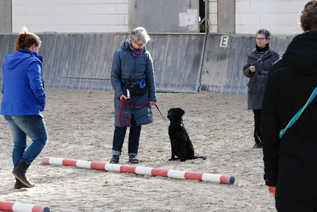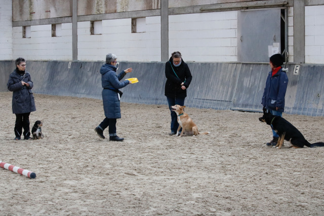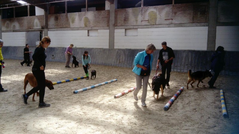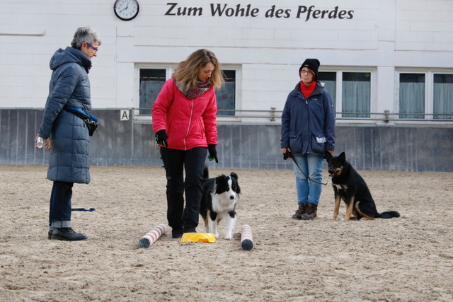 Das gelbe ist ein Futternapf. Dorthinein rieselten vor den Hundenasen laut Leckerchen hinein. Anschließend mußten die Besitzer mit ihren Hunden zwischen den Stangen am gefüllten Napf vorbei, ohne dass hinterher eins fehlt ;o)