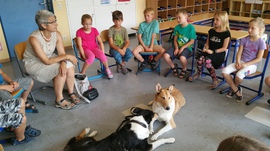 Aufgeregt und gespannt freuten sich die Kinder der Klasse 2a schon seit der Ankündigung auf den geplanten Hundebesuch im Rahmen der Unterrichtseinheit „Haustiere“ im Sachunterricht. Am 6. Juni war es dann endlich soweit: Die erfahrene Hundetrainerin Renate Wiesler-Grauer kam zusammen mit ihren beiden Kurzhaarcollies Robin und Silja in die Klasse, um den Kindern den richtigen Umgang mit den Vierbeinern ganz praxisnah zu zeigen. Zunächst einmal stellten die Schüler zahlreiche Fragen und zeigten sich sehr wissbegierig. Warum ist die Nase des Hundes immer feucht? Wie viele Zähne hat ein Hund? Wie viele Hunderassen gibt es? Glücklicherweise hatte die Hundetrainerin auf jede noch so knifflige Frage eine Antwort und konnte den Kindern anschließend noch einiges über das Verhalten und den Umgang mit einem Hund erzählen. Wichtig ist beispielsweise, dass man sich einem Hund immer von vorne nähern sollte und den Besitzer erst fragen muss, wenn man einen Hund streicheln möchte. Höhepunkt des Besuchs - sowohl für die Hunde als auch für die Kinder - waren die Streicheleinheiten zum Schluss, die mit einem Leckerli gekrönt wurden. Bei dem ein oder anderen erforderte das Reichen des Leckerlis mit der flachen Hund auch etwas Mut – schließlich gehören Kurzhaarcollies zu den eher größeren Hunderassen. Letztlich haben sich aber alle Kinder getraut und so bekamen Silja und Robin jede Menge Leckerlies!